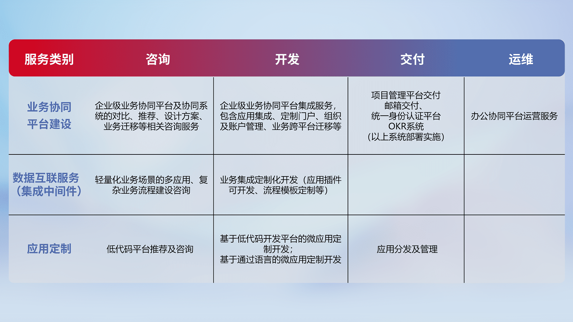 针对钉钉、、、、企微、、、IDaas等平台级产品提供产品的规划、、、、方案、、交付、、、、定制化开发等服务,,实现如统一协同办公、、、智能客户服务、、、、混合会议管理、、、、智能数据查询、、等业务场景,,,,实现数字化转型。。。。
