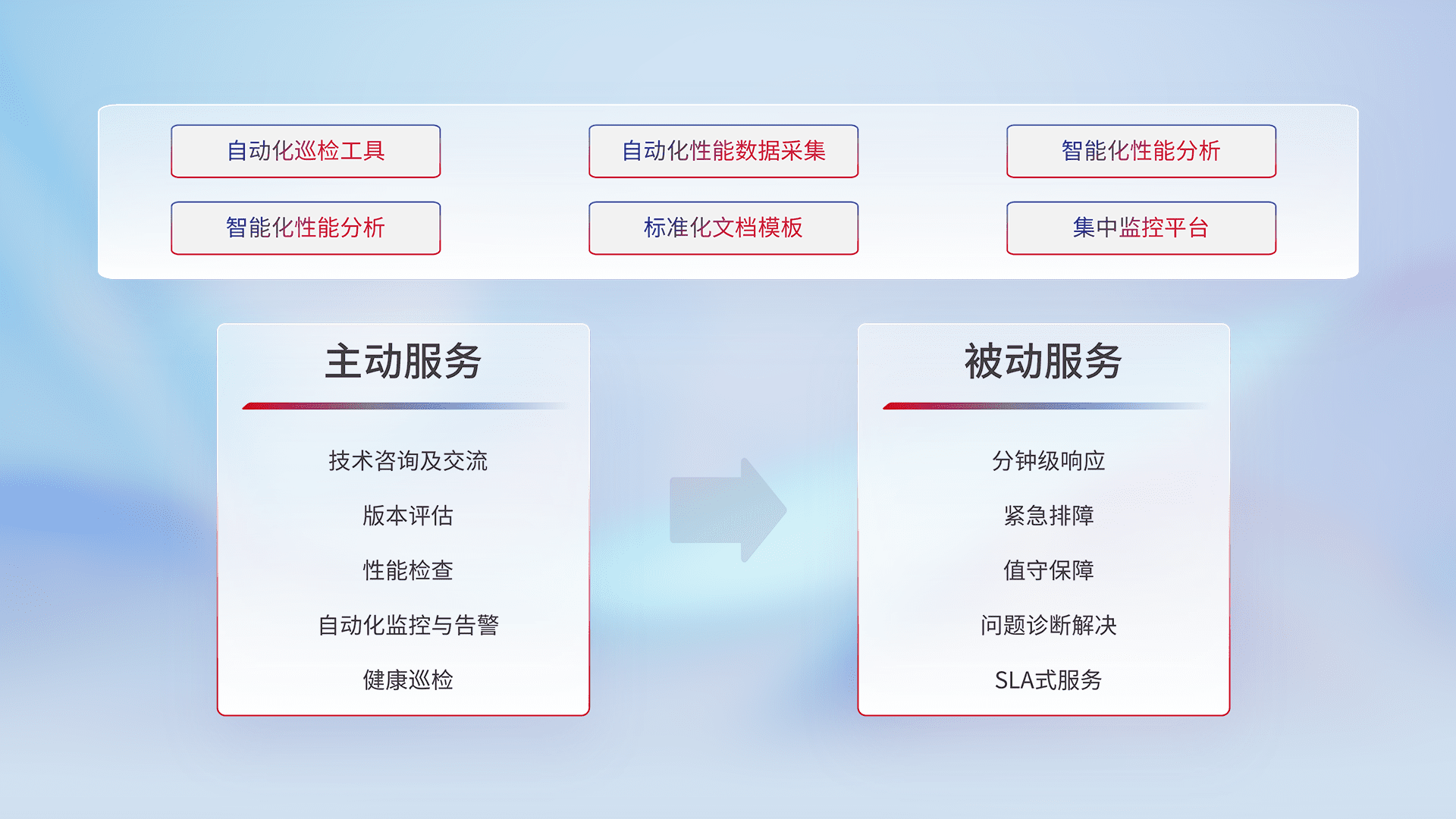 智能化工具和标准化文档,,,,保障服务质量,,提供主动服务(包含技术咨询、、、、版本评估、、、性能检查、、、、自动化监控与告警、、、健康巡检)和被动服务包含(分钟级响应、、、紧急排障、、、值守保障、、、、问题诊断解决、、、SLA服务)。。。。