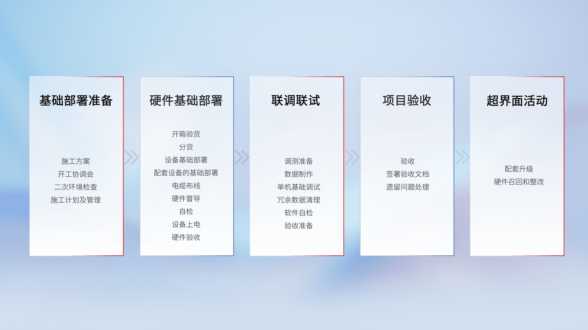 从基础部署准备、、、硬件基础部署、、、、联调联试、、项目验收、、、越界面活动的全过程可追溯,,,保证施工质量和进度。。。